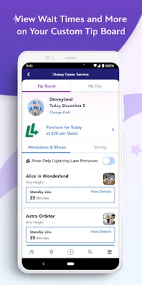 Say goodbye to long wait times and confusion with the Tip Board feature. Create your own personal Tip Board to track estimated wait times for your favorite experiences and more. This feature helps you plan your day and make the most of your time at the park.