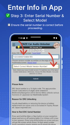 ERC Car Audio/NAVI Unlocker is a companion app of π ERCUnlocker.com to unlock the full potential of your car's audio and navigation units with ERC Unlock Code for the π Japanese-built cars.