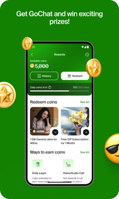 As a GoChat user, you can earn GoChat Coins that can be redeemed for free mobile data, VIP subscriptions, and premium stickers. It's our way of saying thank you for choosing GoChat as your go-to communication app.