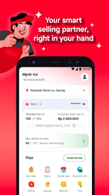 Stay on top of your restaurant's performance with the GoFood Merchant app. View transaction history and sales reports by period, monitor your restaurant's performance, and check your rating and customer reviews directly in the app.
