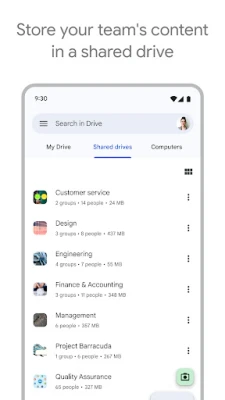 Sharing files and setting permissions is made simple with Drive. You can easily share files and folders with others, and even create a shared drive for your team to store all of your content. Plus, Google Workspace subscribers have access to additional security and management controls to meet data compliance needs.