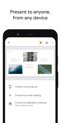 Create, edit, and collaborate on presentations from your Android phone or tablet with the Google Slides app. With Slides, you can: