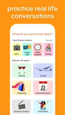 Vocabulary is crucial for speaking languages fluently, and Learna AI has you covered. Our app focuses on teaching practical and useful words and phrases for daily conversations. With vocabulary practices that adapt to your level, you'll have a broad range of words at your disposal, helping you speak more naturally and confidently.