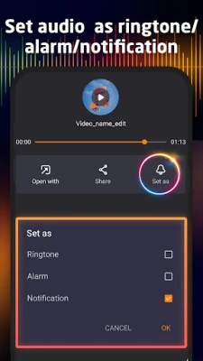 Once you've converted your video to MP3, use the ringtone maker to set it as your phone's ringtone or share it with friends. Say goodbye to boring ringtones and hello to personalized ones with Audio Cutter & MP3 Converter.