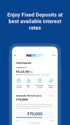 With Paytm Payments Bank, you can make the most of your excess balance by simply sliding to create automatic fixed deposits at the end of each day. This feature helps you save money effortlessly and earn attractive interest rates. And with our partner banks, you can trust that your money is in good hands.