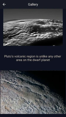 Pluto 3D allows you to explore the entire surface of the dwarf planet at high resolution with ease. To see the Pluto's heart, or to take a closer look at its main craters, mountains and fossae, just tap on the left side menu and you will be instantly teleported to the respective coordinates. Pluto is made primarily of ice and rock and is much smaller than the inner planets. Gallery, Pluto data, Resources, Rotation, Pan, Zoom In and Out, represents more pages and features you can find in this nice app.