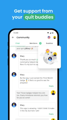 Surrounding yourself with non-smokers can make quitting easier. QuitNow provides a chat filled with ex-smokers who understand the struggles and triumphs of quitting. Connect with others and receive support and encouragement on your journey.