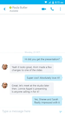 With the Skype for Business Mobile app, you can easily share your video and view the speaker's video during a conference. Take control of the meeting by muting or removing attendees and get to know more about participants' modalities. Plus, you can join upcoming meetings with just one click and pick up recent conversations from where you left off.
