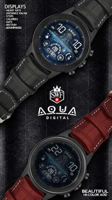 SWF Swiss Watch Faces are crafted and made in Switzerland and showing an very high grade of details. With it's clear and modern design, the SWF Aqua Digital edition is built to guide you through the time of each day. Admire the impressively animated clockwork in the background while in the foreground most smartwatch information are displayed at a glance.