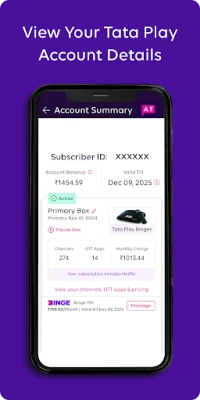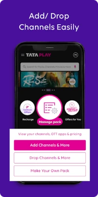 With Tata Play Mobile App, managing your DTH account has never been easier. View your account details, add or drop channels, and even create your own pack based on your interests. Take control of your DTH plan with just a few taps on your mobile device.