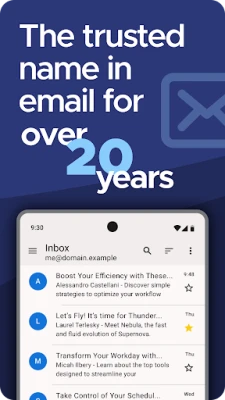 With over 20 years of experience, Thunderbird is a trusted name in email - now available on Android. Our app is fully funded by voluntary contributions from our users, so you can rest assured that your personal data will never be mined or sold. Plus, our team is dedicated to creating an efficient and user-friendly experience, so you can spend less time in the app and more time on what matters.