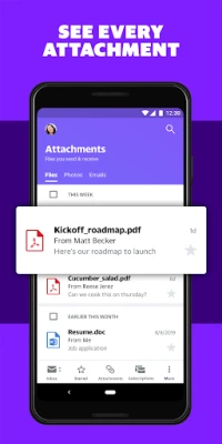 Looking for a specific document or photo? Yahoo Mail Go has a dedicated attachments view that displays all your files in one place. No more scrolling through endless emails to find what you're looking for. It's all right here, making your life a whole lot easier.