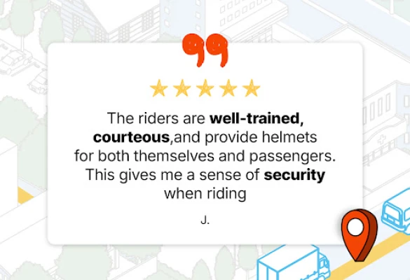 Ride with confidence! Angkas boasts an impressive 99.997% safety rate, the highest among our competitors. Plus, all our rides are insured, covering both the biker and the customer. When you grab a motorcycle taxi with Angkas, your ride hailing experience is safe and secure. Safety is our top priority for every motorcycle taxi ride and delivery.