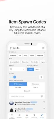 Need to spawn a specific item in-game? Our item ID and GFI code list has over 1,000 Ark items for you to search through. With our filters, you can easily find items from specific DLCs and categories. Plus, you can view an item’s spawn command, GFI code, item ID, or blueprint with just a few taps.