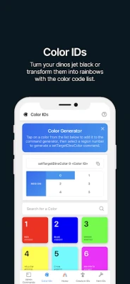 Want to give your dinos a unique look? Our app also includes a full list of all Ark color IDs. With just a tap, you can get a color’s ID or use our command generator to easily apply the color to your dinos in-game.