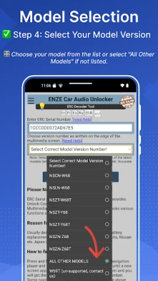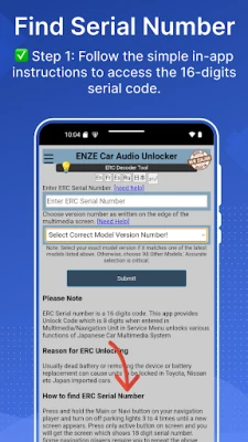 Finding your ERC Serial Number is quick and easy with ERC Car Audio/NAVI Unlocker β±οΈ. Simply press and hold the main button π on your navigation player while toggling your parking lights π¦ a few times. A new screen will appear displaying your 18-digit serial number π’. Retrieve the serial number by pressing the active button on the screen. For detailed instructions, visit our help section in the app or on support website: π www.ercunlocker.com/guide.html.