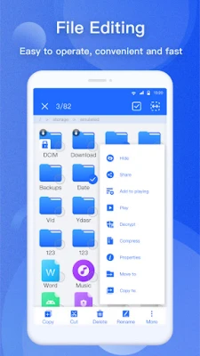 Manage your files like you do on your desktop or laptop using Multiple Select, Cut/Copy/Paste, Move, Create, Delete, Rename, Search, Share, Send, Hide, Create Shortcut, and Bookmark.