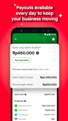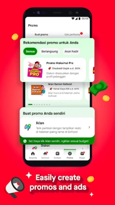 With the GoFood Merchant app, you can easily withdraw your restaurant's earnings daily with automatic or manual payout options. Plus, you can reach more customers by offering attractive discounts through Gojek-supported promotional programs and managing your own ads to get your restaurant featured more prominently in the Gojek app.