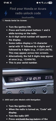 Not sure where to find your serial number? No problem! Our app provides easy-to-follow instructions for finding your serial number based on your Honda model and year. For 2001-2009 models, simply hold 1 + 6 and turn on the radio to display the serial number. For 2010+ models, the serial number can be found on a label after removing the radio or in your owner's manual. Need more help? Search for your specific Honda model on YouTube.