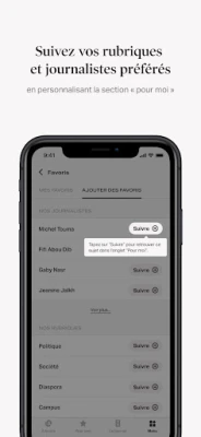 – Suivre vos rubriques et journalistes préférés en personnalisant la section « Pour moi ».