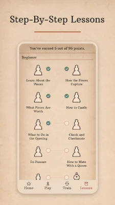 - **Gradual Learning of Chess Vocabulary:** Expand your vocabulary and understanding of key terms and concepts at a comfortable pace.