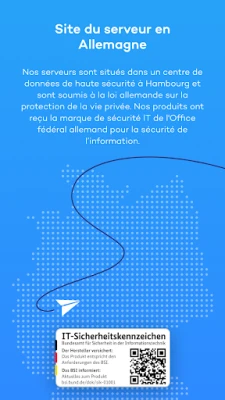 pour protéger votre communication, vos données sont toujours chiffrées, que vous accédiez à Internet par le biais d'un wifi public ou d'un réseau privé. Notre application utilise une technologie de chiffrement ultramoderne et est soumise à la loi allemande stricte sur la protection des données en raison de notre siège social, qui se trouve en Allemagne.
