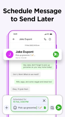 • Schedule Messages: Use our Message scheduler to set up messages to be sent at specific times and dates. Schedule birthday wishes, work reminders, and more with ease.