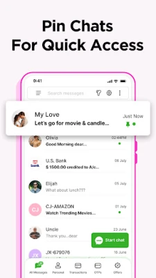 With our built-in SMS Messenger organizer, manage your messenger inbox effortlessly by automatically categorizing them into Personal, Transactions, OTPs, and Offers.