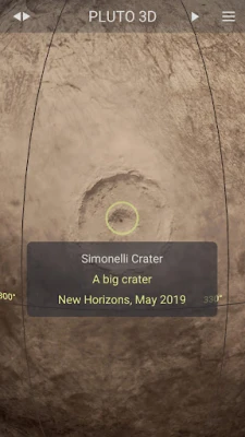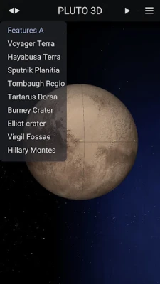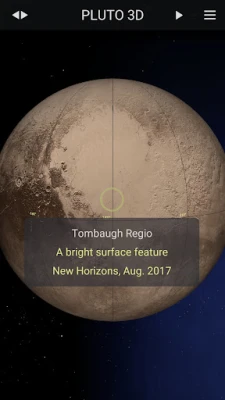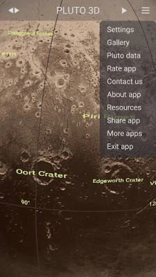 Pluto 3D allows you to explore the entire surface of the dwarf planet at high resolution with ease. To see the Pluto's heart, or to take a closer look at its main craters, mountains and fossae, just tap on the left side menu and you will be instantly teleported to the respective coordinates. Pluto is made primarily of ice and rock and is much smaller than the inner planets. Gallery, Pluto data, Resources, Rotation, Pan, Zoom In and Out, represents more pages and features you can find in this nice app.