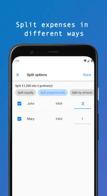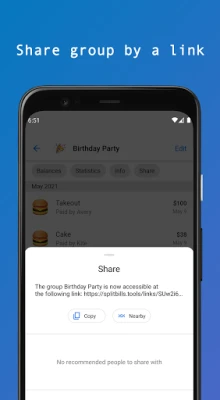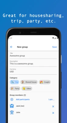 1. Create a group to add expenses. 2. Split all expenses for all participants. 3. Split expenses in different ways. 4. Share the created group to friends by a link.