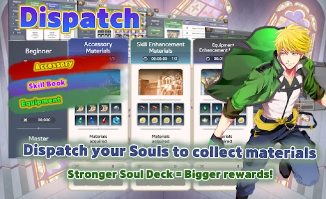 Want to make your Souls unstoppable? Use the Dispatch system to send Souls that have reached a certain level on treasure hunts. Earn crafting materials for equipment upgrades, skill enhancements, and booster tickets to power up your battles. Keep in mind, your rewards will scale with the combat power of the Souls you dispatch.