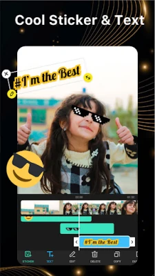 - Customize your videos by adding stickers, text & images to create your unique masterpiece.
