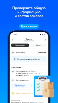 Для курьеров: • Смотрите адреса и статусы заказов на карте или списком; • Проверяйте общую информацию и состав заказов; • Отслеживайте график выхода на рейс и гибко управляйте временем.