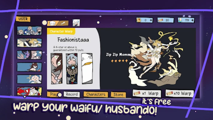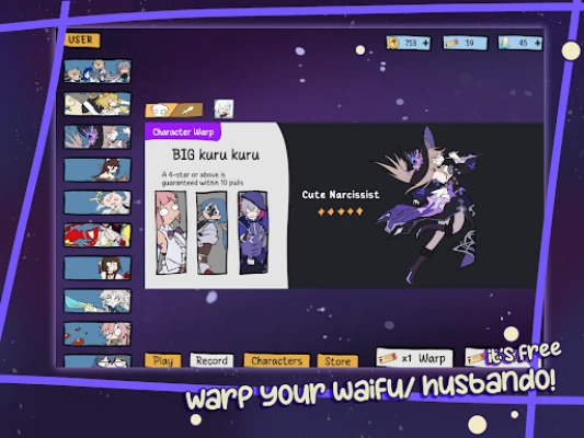 - Gacha: Warp your beloved characters and cool items for them